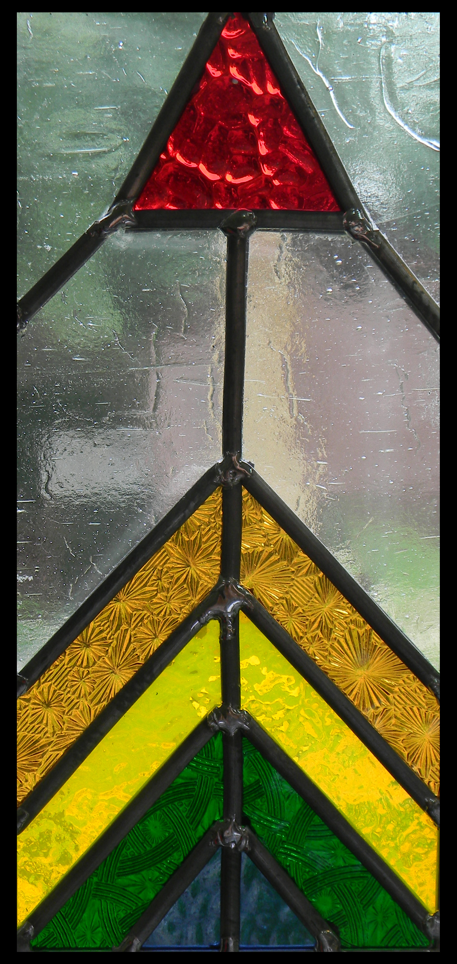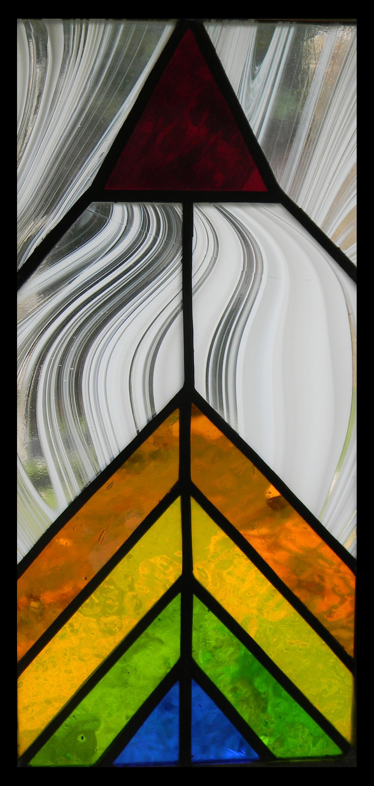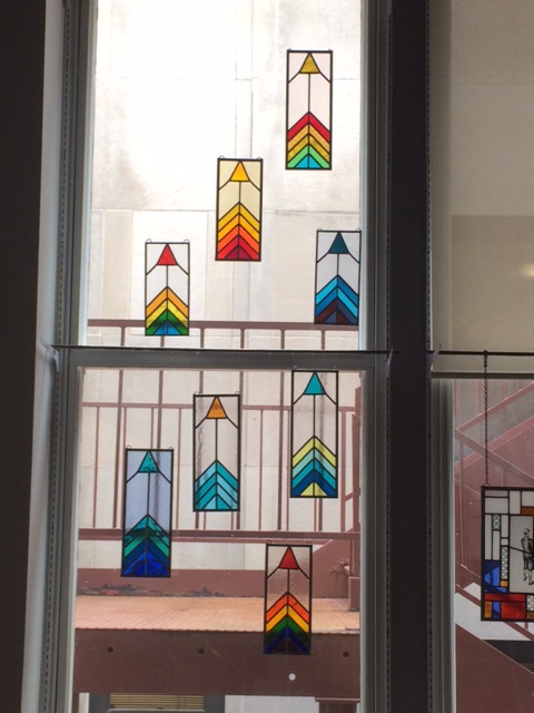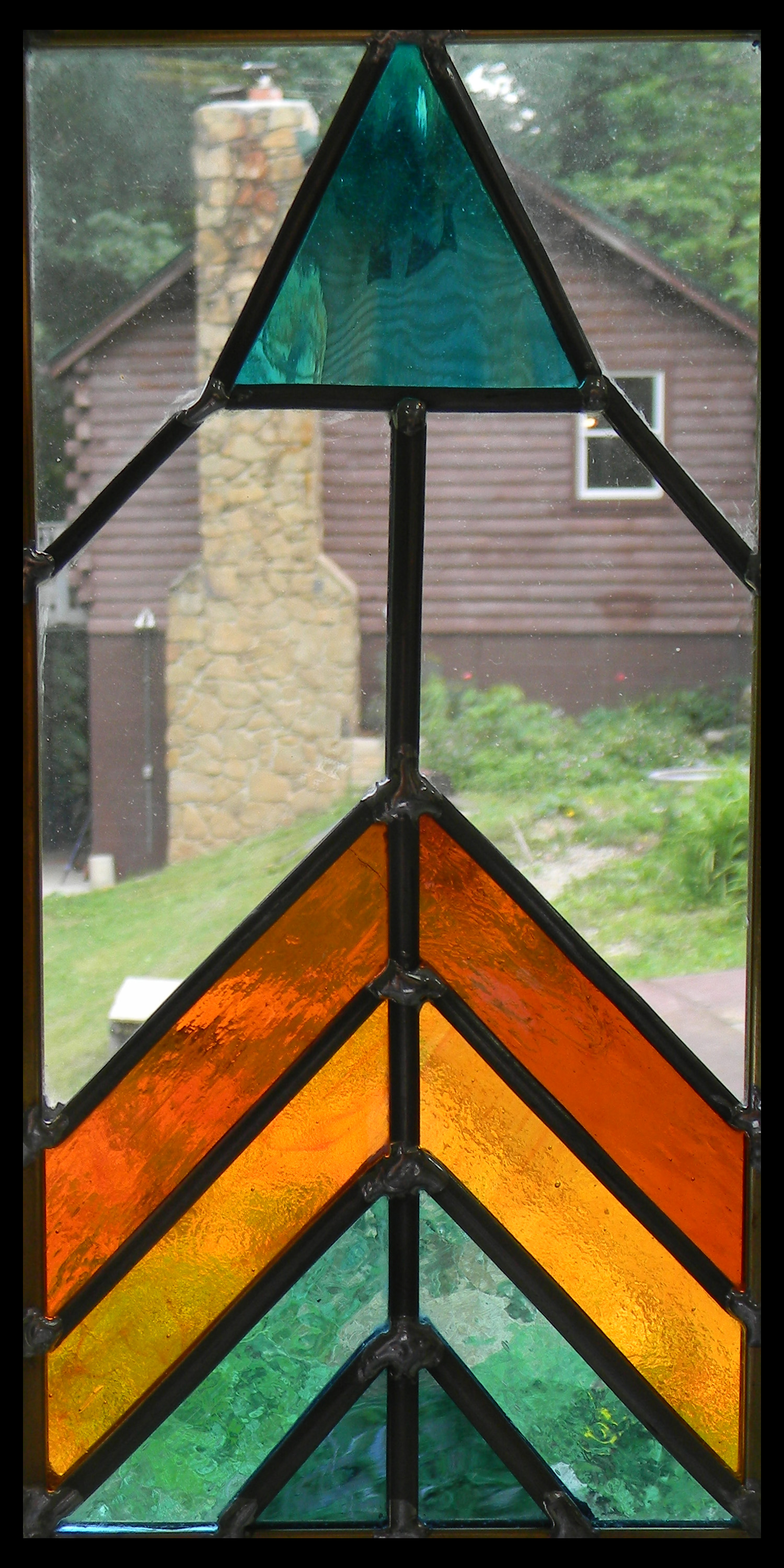In 2016, I made a small installation of the arrows at the Ivy Tech John Waldron Arts Center. I am currently searching for a public venue to have a larger installation of around 100+ arrows. If you are interested in having your own arrow, I have many available or can make one with your color choices. They are around 7″ x 15″, made with lead came and stained glass, and cost between $125-$175 each.