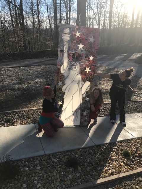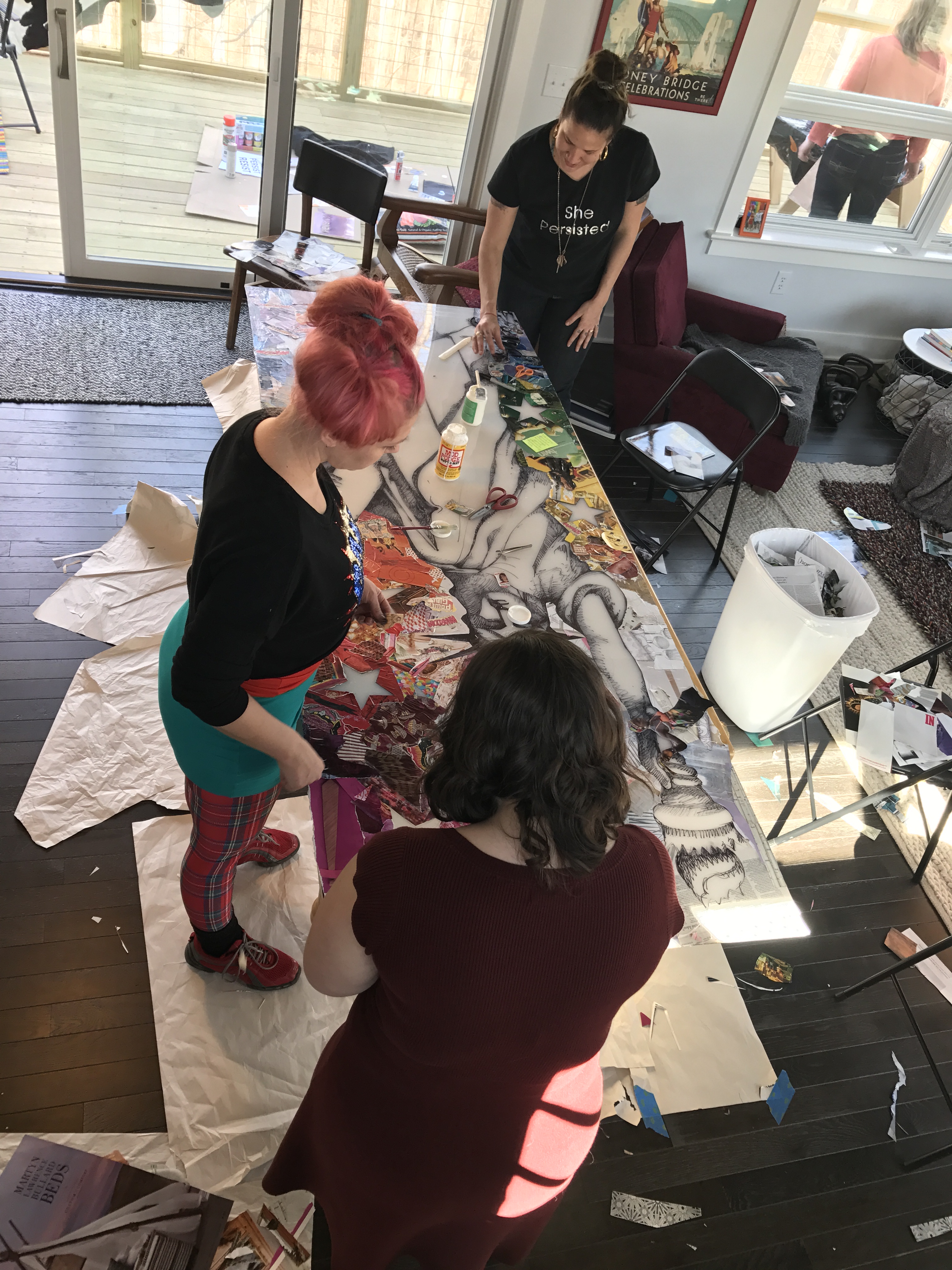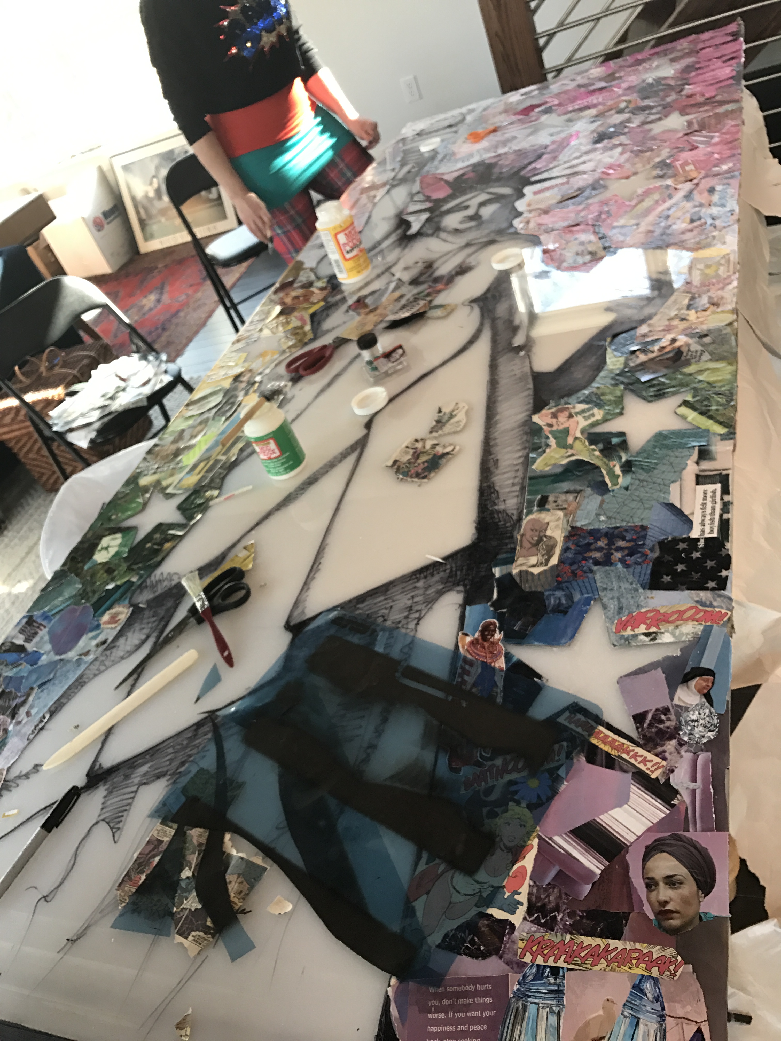 After the Women’s March on Washington, we were inspired to follow in the steps of the Women’s March intentions and planned a collaborative art piece to make on the day of the General Strike. I drew the Statue of Liberty on the plexiglass and a group of women collaged around her with images meaningful to them and the movement. It was then shown in the Gather gallery space in Bloomington, Indiana in March 2017.